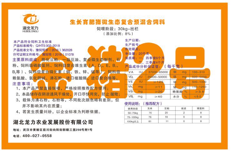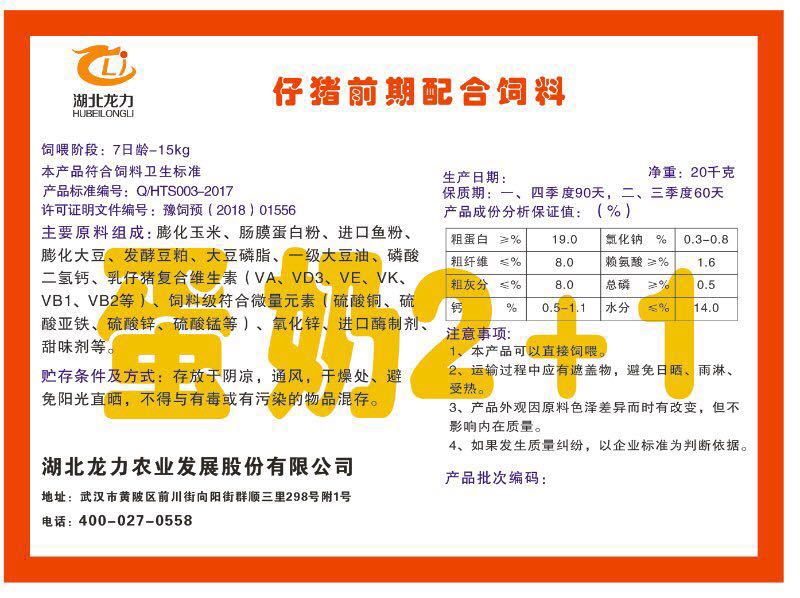 湖北龍力農(nóng)業(yè)發(fā)展股份有限公司坐落于武漢市黃陂區(qū)前川街向陽街群順三里298號附1號。公司成立于2014年6月,公司自成立以來把“創(chuàng)全球最大養(yǎng)豬綜合服務”為企業(yè)愿景。致力于打造教保料品牌”作為公司發(fā)展的明確目標。公司一直致力于豬營養(yǎng)的研究和開發(fā),積極與國內(nèi)外高校和科研機構(gòu)合作,推廣養(yǎng)豬技術(shù)、動物營養(yǎng)新概念,向世界農(nóng)牧企業(yè)學習與合作。公司采用國內(nèi)先進的生產(chǎn)工藝,選擇高精度電子配料秤,高均勻度、無殘留混合機等先進設備....